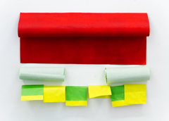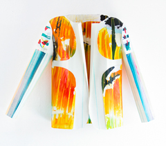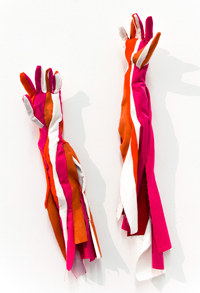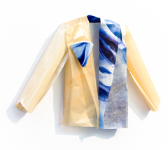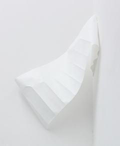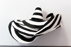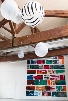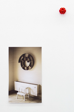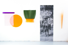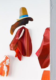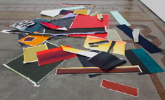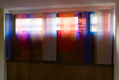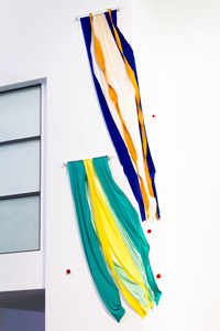 Installation, découpes de film transparent orange sur carton canson ondulé.