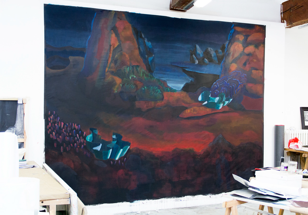 Painting, acrylic paint on black studio background paper, 360x250 cm.